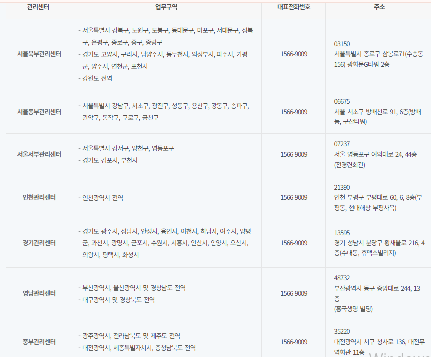 관리센터 콜센터 번호는 1566-9009로 통합되어 운영됩니다.