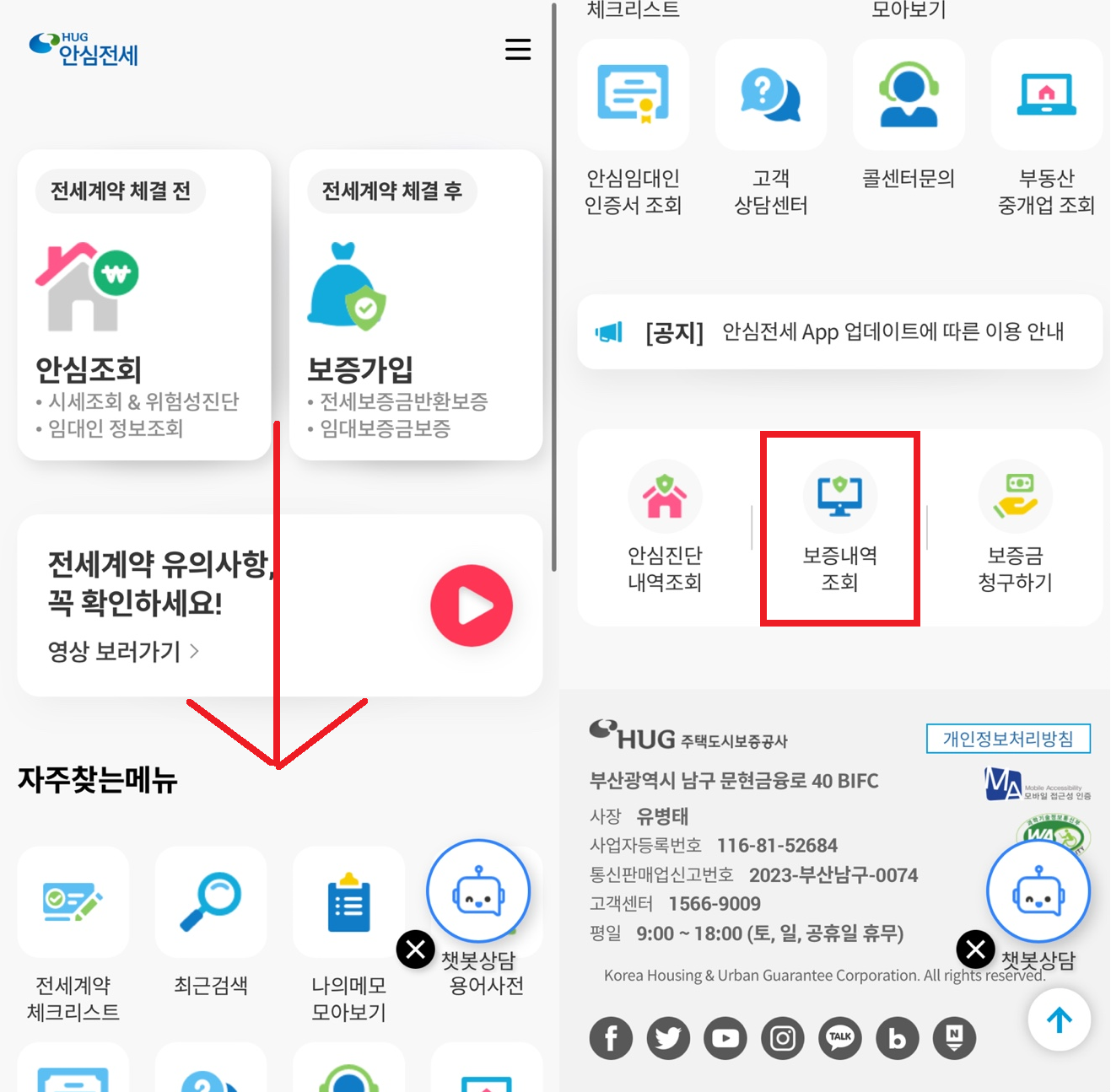 1. HUG안심전세 앱을 다운로드 후 로그인을 하신 다음에 어플 하단으로 스크롤을 내려주세요.